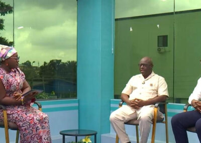 The initiative’s first fellow, Dr. Kwabena Agbedinu (to the far right) is illustrated while performing a CRC screening awareness campaign on national television.