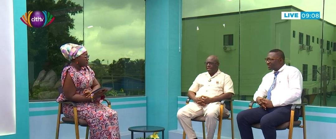 The initiative’s first fellow, Dr. Kwabena Agbedinu (to the far right) is illustrated while performing a CRC screening awareness campaign on national television.