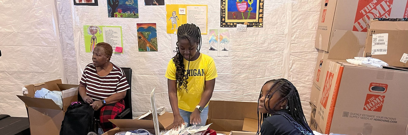 Dr. Kwakye and her family sorting donations for their trip to Ghana in April 2024. All donations pictured consist of unusued materials from operating rooms within the University of Michigan Hospital that were en route to be thrashed or recycled.