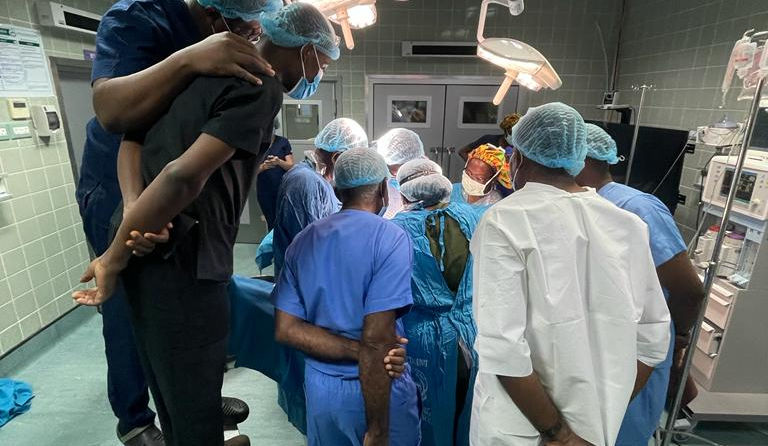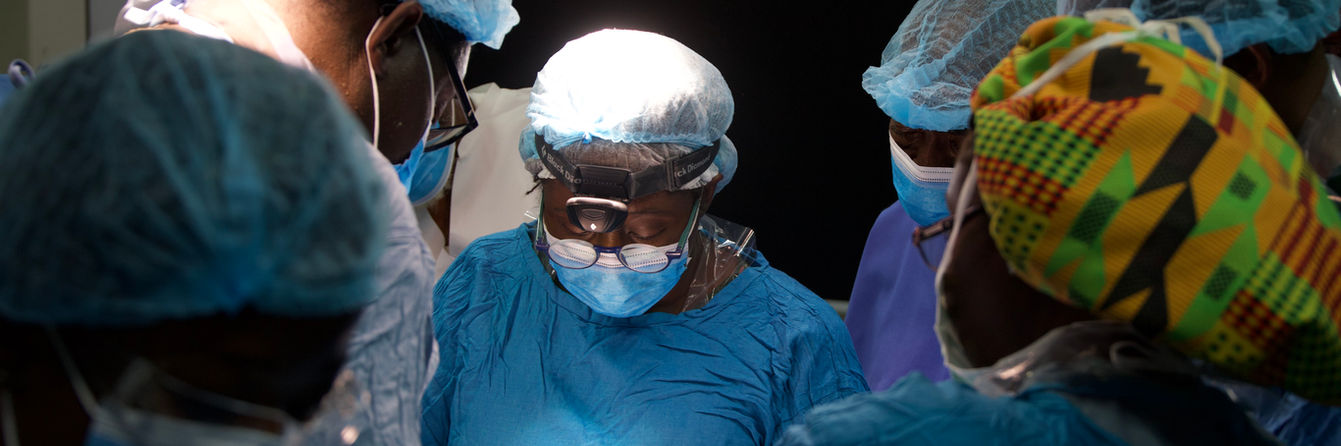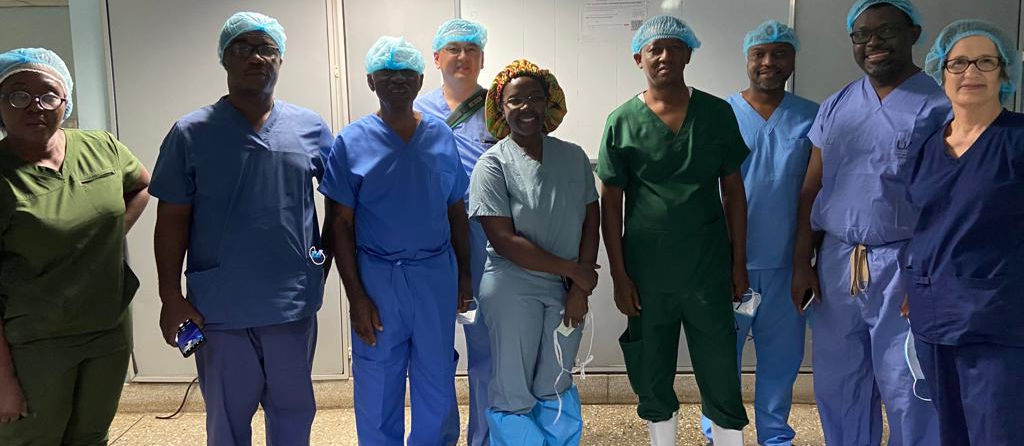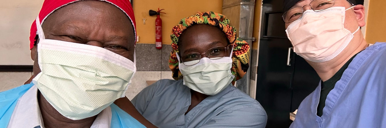 Dr. Huang operating with the Head of Surgery Department, Dr. Dally, and Dr. Agbedinu.