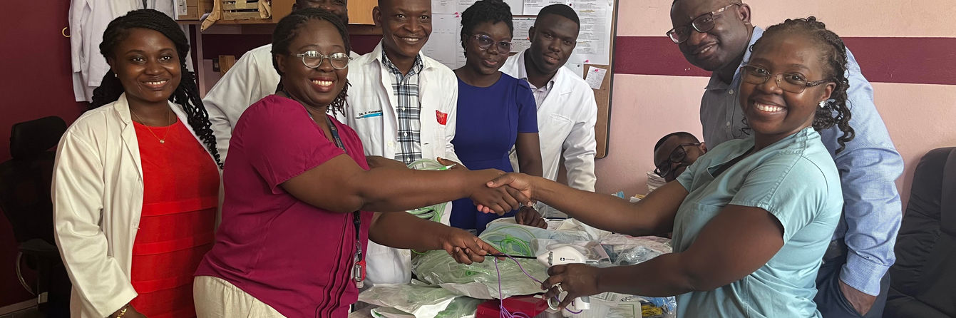 An image of the April 2024 trip to the Komfo Anokye Teaching Hospital in Ghana, illustrating a portion of donated supplies being delivered to the CEO of KATH and the hospital’s surgery leadership.